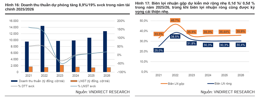 VNDirect dự báo doanh thu thuần sẽ tăng 8.9%/19% so với cùng kỳ và EPS tăng 9%/19.2% so với cùng kỳ trong năm 2025/2026, nhờ chuyển dịch cơ cấu sản phẩm linh hoạt để tận dụng điều kiện giá thuận lợi.