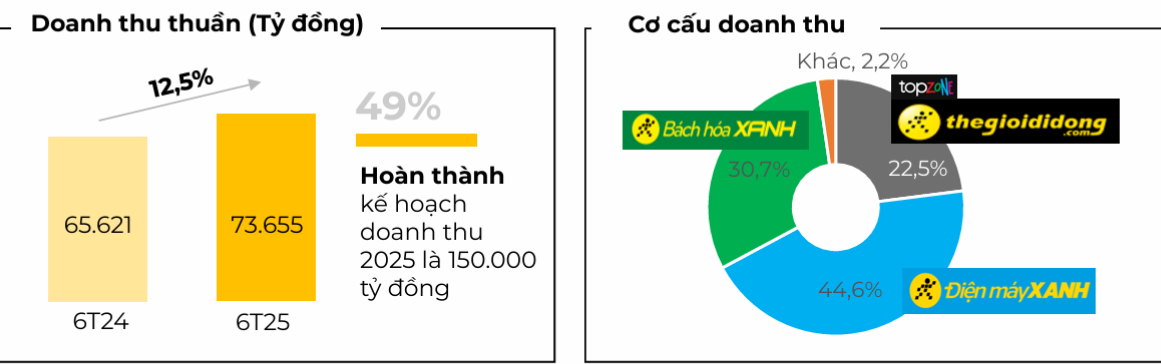 Sau tái cấu trúc, mạng lưới giảm ròng ~200 điểm bán nhưng doanh thu vẫn tăng 12 % YoY lên 49.4 ngàn tỷ, nhờ SSSG > 12 % và cơ cấu sản phẩm dịch chuyển sang laptop–tablet, gia dụng cao cấp.