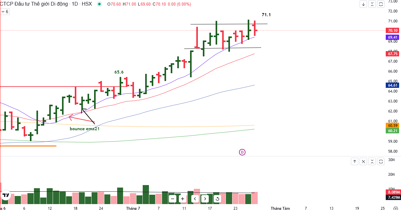 - Trên đồ thị giá, MWG có RS=81, thuộc nhóm các cổ phiếu khỏe đang hoạt động trên thị trường. Tuy nhiên, MWG hiện tại đang gặp cung cản mạnh, đồng thời về vùng định giá của các công ty chứng khoán đặt ra, hiện tại chưa khuyến nghị giao dịch ở MWG.