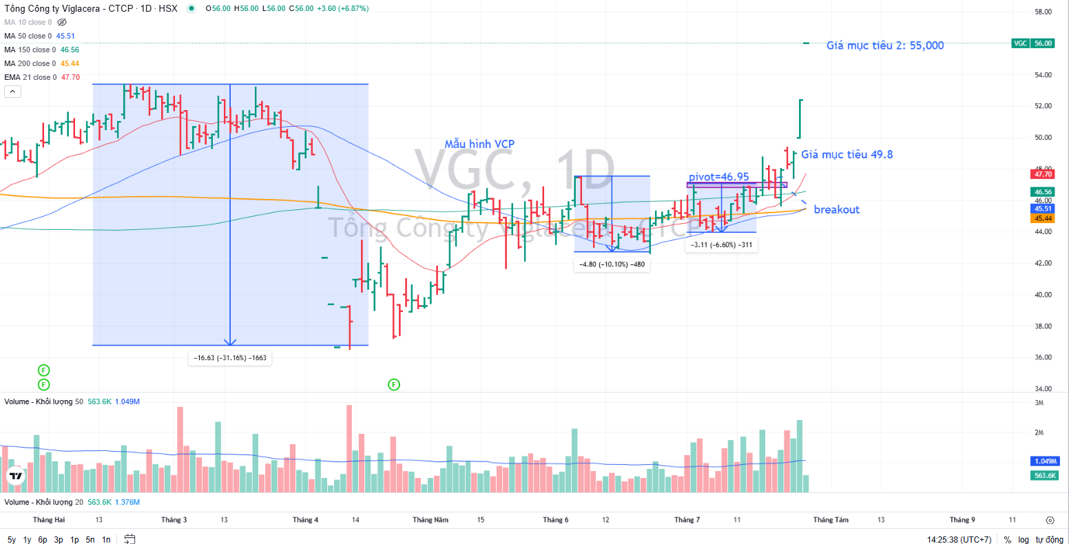 Trên đồ thị, VGC liên tục tăng mạnh sau khi breakout mẫu hình VCP (Độ Biến Động Thu Hẹp) vào ngày 24.7.2025, vượt qua điểm mua 46,950. Hiện tại, VCG đang đến mục tiêu giá 55,000. Đây là vùng đỉnh của tháng 3 năm 2024. Không có khuyến nghị giao dịch ở thời điểm hiện tại khi đã tăng +20% kể từ điểm breakout (vùng chốt lãi).
