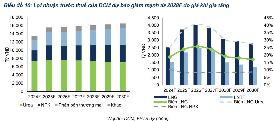 - Urê: 2025F doanh thu urê dự kiến tăng khi giá bán +3.3% YoY, sản lượng +3% YoY (đẩy mạnh xuất khẩu khi cầu nội địa yếu). Từ 2028, chi phí khí có thể cao hơn do hợp đồng mới +1 USD/mmBTU và tăng tỷ trọng khí giá cao ở Tây Nam Bộ.