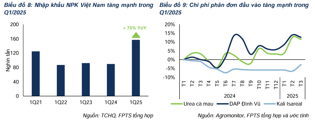 Sau thương vụ mua lại KVF, DCM đã tăng gấp đôi công suất NPK lên 660 nghìn tấn/năm, thị phần nội địa ~8.5%; 2025F, FPTS dự phóng sản lượng tiêu thụ NPK +25% nhờ giá cà phê, cao su, hồ tiêu tăng.