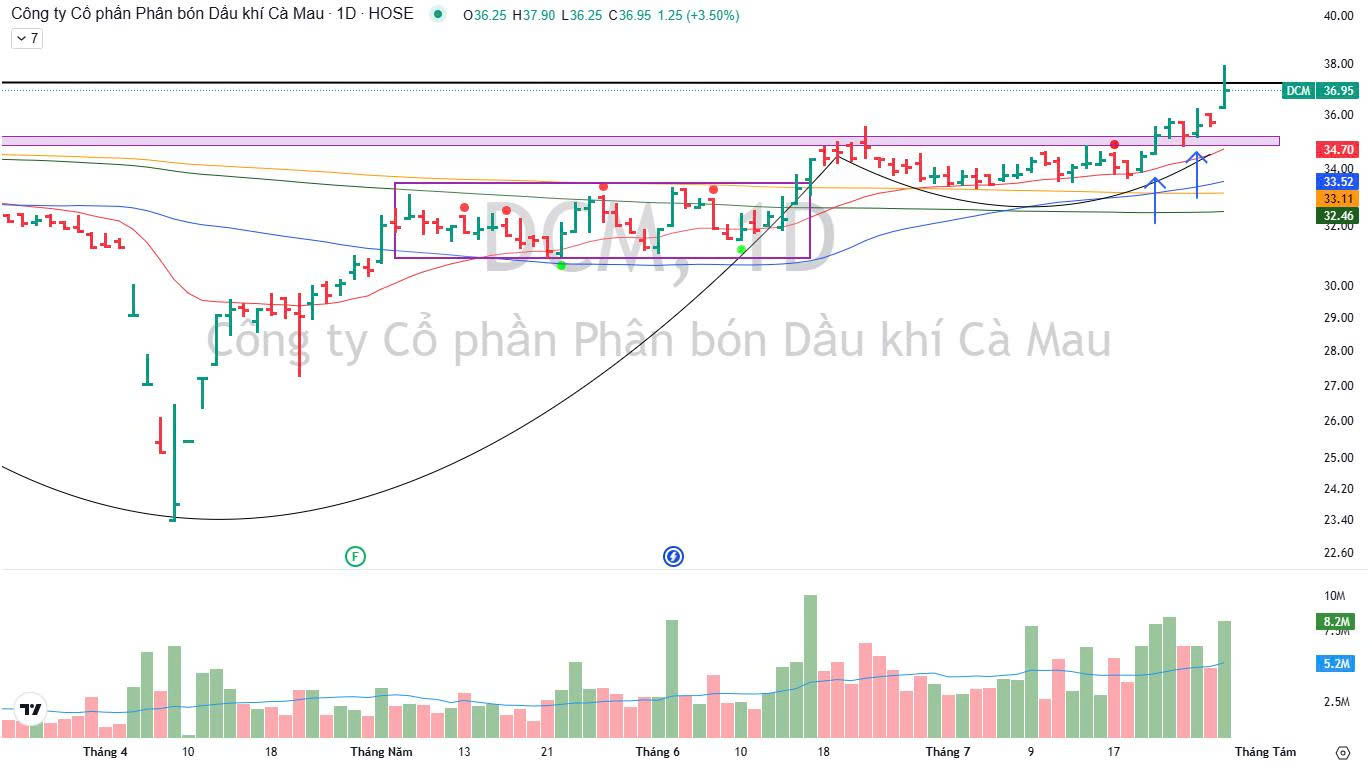 Trong ngắn hạn, cổ phiếu DCM có thể gặp khó khi thị trường đang chờ thêm chất xúc tác ngành (ví dụ sóng phân bón). Về mặt kỹ thuật, vùng giá hiện tại cũng đang gặp kháng cự mạnh từng hình thành trong 2022 và 2024.