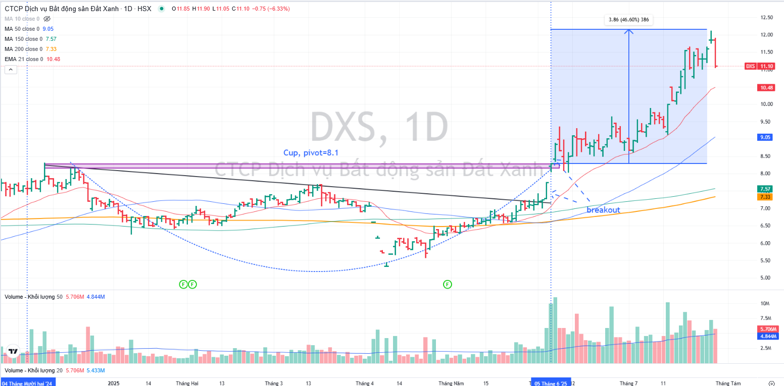 Tuy nhiên, DXS đã tăng giá hơn 40% kể từ điểm breakout vùng tích luỹ ngày 6.6.2025. Vì điểm breakout diễn ra khi thị giá còn dưới mệnh nên không được đếm nền giá.