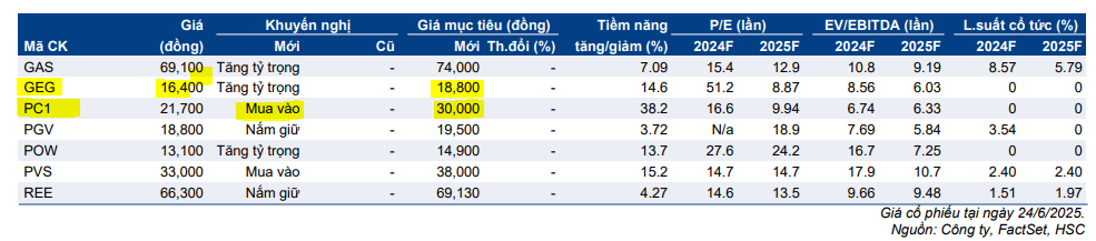 Hai cổ phiếu nổi bật được HSC khuyến nghị: PC1: hưởng lợi từ đầu tư lưới truyền tải 500kV và điện gió; giá mục tiêu 30,000đ. GEG: có thể tận dụng DPPA và đã ký PPA cho dự án Tân Phú Đông 1; giá mục tiêu 18,800đ