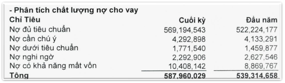 • Tổng nợ xấu 14,472 tỷ (2.46 %); riêng nhóm 5 nhảy 17 % lên 10,408 tỷ, trong khi hệ số bao phủ (LLR) mới 68-69 % – thấp hơn ngưỡng 100 % an toàn