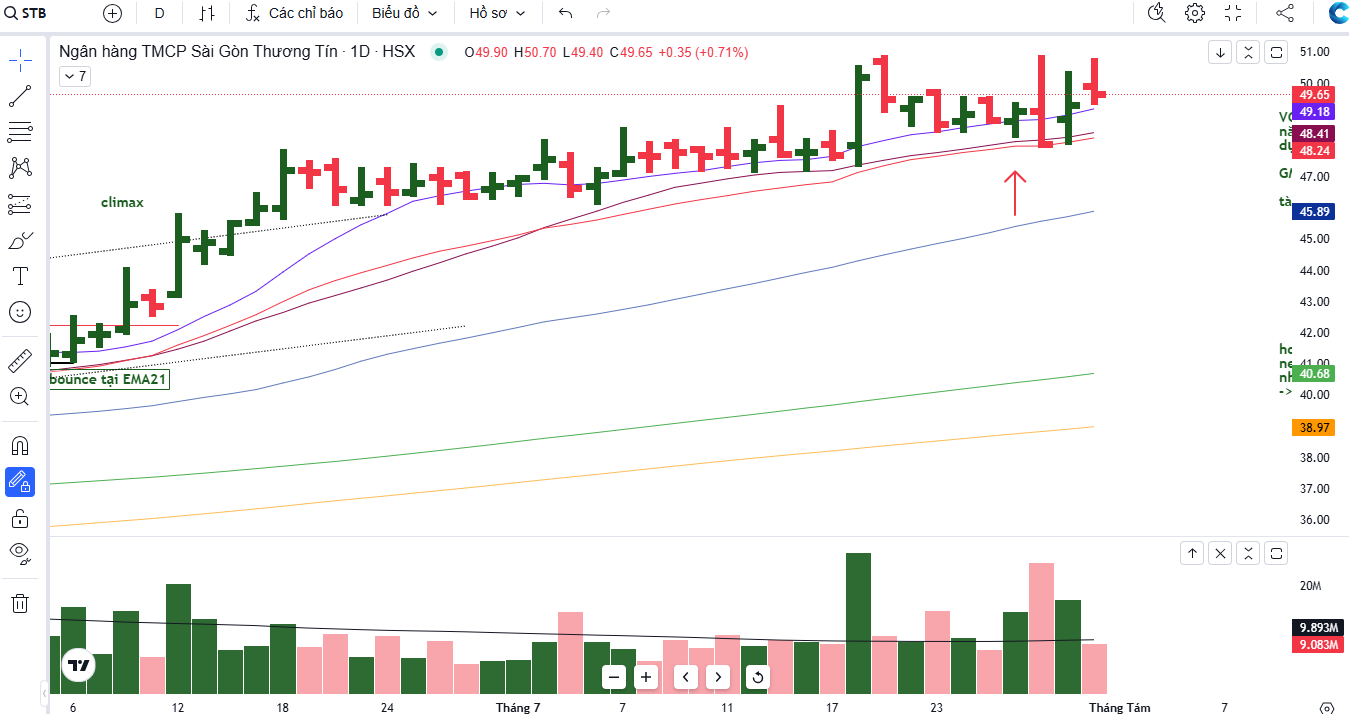 Trên đồ thị kỹ thuật, STB có RS=87, thuộc nhóm các cổ phiếu hoạt động tốt trên thị trường. STB có nền giá dốc lên, và đã breakout thành công ngày 18/7/2025. Lưu ý, các điểm breakout hiện tại không hoạt động hiệu quả, team chưa khuyến nghị giao dịch trở lại STB, cần quan sát thêm.