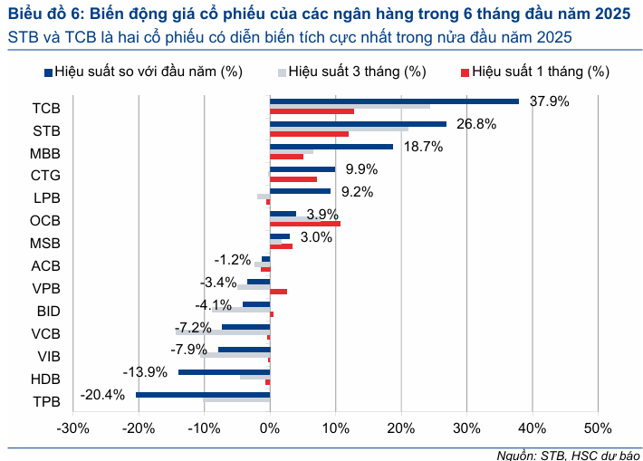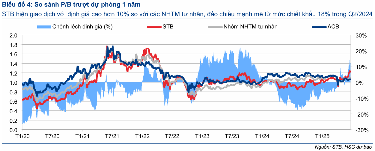 • Beta cao: free-float 42 %, GTGD 46 tỷ/phiên; cổ phiếu dễ bị “kéo – xả” mạnh theo tin đồn (HSC ghi nhận STB là mã tăng 58 %/12 tháng – cao nhất top private banks). STB thường phản ứng mạnh khi dòng tiền đầu cơ tìm tới nhóm mid-cap ngân hàng, phù hợp cho “đánh sóng” hơn là vị thế core khi so với VCB/TCB.