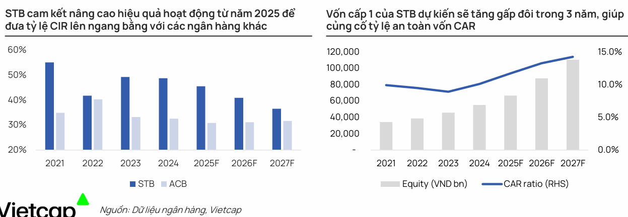 Vietcap dự báo Equity của STB sẽ tăng gấp đôi trong ba năm tới, đưa CAR tiến sát 12 %. Với lợi suất trái phiếu đang thấp, NHNN có xu hướng phân bổ hạn mức cao cho ngân hàng có vốn dày → STB có thể duy trì tăng trưởng cho vay ≥14 %/năm mà không cần pha loãng cổ phần.