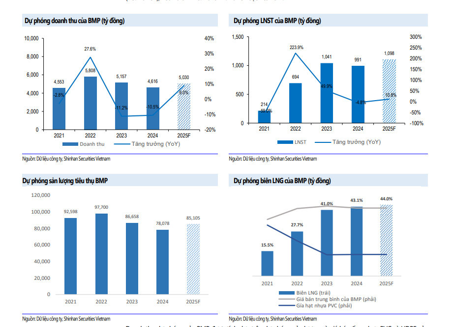 - Chính sách cổ tức: Shinhan đánh giá BMP là “con gà đẻ trứng vàng” với tỷ lệ chi trả cổ tức tiền mặt cao (trên 95% LNST), mang lại lợi suất hấp dẫn cho nhà đầu tư.