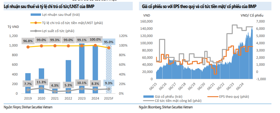 Cổ phiếu BMP được đánh giá là “gà đẻ trứng vàng” với tỷ lệ chi trả cổ tức tiền mặt trên 95% LNST, mang lại lợi suất hấp dẫn. Các CTCK dự phóng LNST 2025 quanh 1,100–1,237 tỷ đồng.