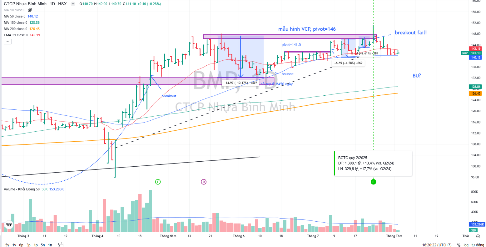 TRên đồ thị, BMP bị breakout fail và đang lùi bước về MA50 ngày. Khả năng BMP cần chiết khấu về vùng thấp hơn để tìm cầu mới.