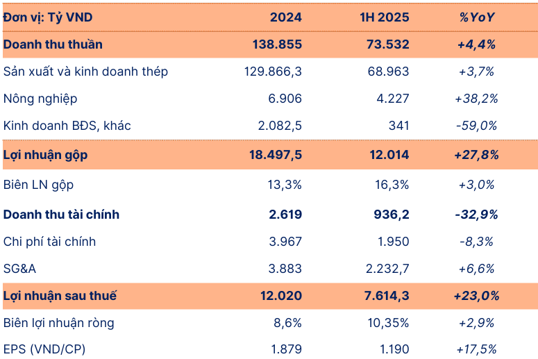 • Quý vừa rồi, Hòa Phát ghi nhận 35,910 tỷ đồng doanh thu (-9.2 % YoY) và 4,264 tỷ đồng lãi ròng (+28.4 % YoY). Dù giá bán thép hạ, biên lợi nhuận gộp vẫn bật lên 18.4 % – mức cao nhất kể từ Q1/2022 nhờ chi phí quặng & than giảm và mảng nông nghiệp lãi lớn.