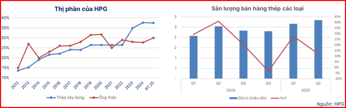 • Sản lượng bán thép Q2 chạm 2.92 triệu tấn (+15.3 % YoY). Riêng HRC bùng nổ hơn 62 %, ống thép +15 %, thép xây dựng +22 % – điều này giúp HPG củng cố vị thế dẫn đầu thị trường nội địa