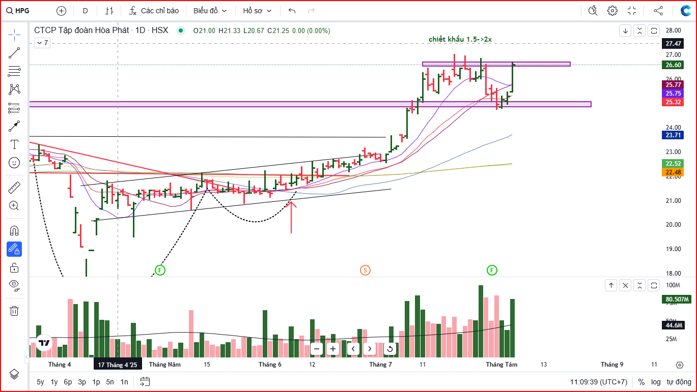 Trên biểu đồ kỹ thuật, HPG đang có RS=85, thuộc nhóm cổ phiếu hoạt động tốt trên thị trường. Hôm nay HPG đang nỗ lực breakout Flat Base, Elibook Team khuyến nghị khóa lãi 1 phần vị thế và chốt phần cổ tức HPG chia, vùng breakout hôm nay không đủ hấp dẫn để fomo mua vào.