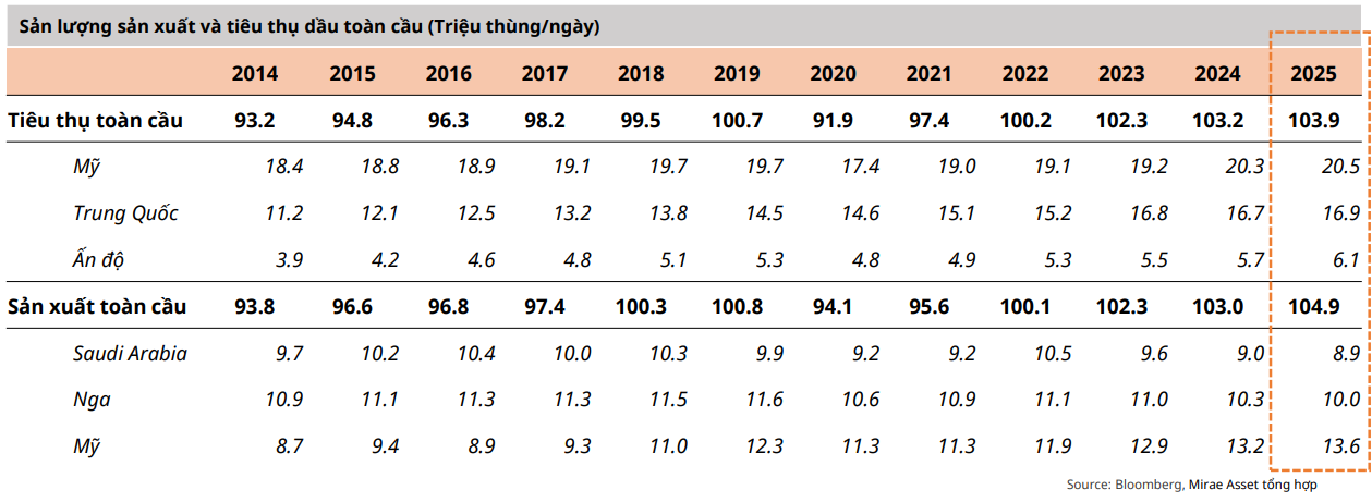 - Tổng cầu dự kiến: ~104 triệu thùng/ngày