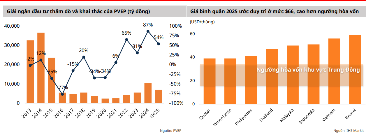 - Vốn đầu tư toàn ngành tăng mạnh: Theo báo cáo MBS, riêng PVEP đã giải ngân 7,034 tỷ đồng trong 6T2025, tăng 54% so với cùng kỳ và cao gấp hơn 4 lần mức đáy năm 2020 – cho thấy đà tăng trưởng đầu tư không còn mang tính thăm dò, mà đã chuyển sang giai đoạn tăng tốc.