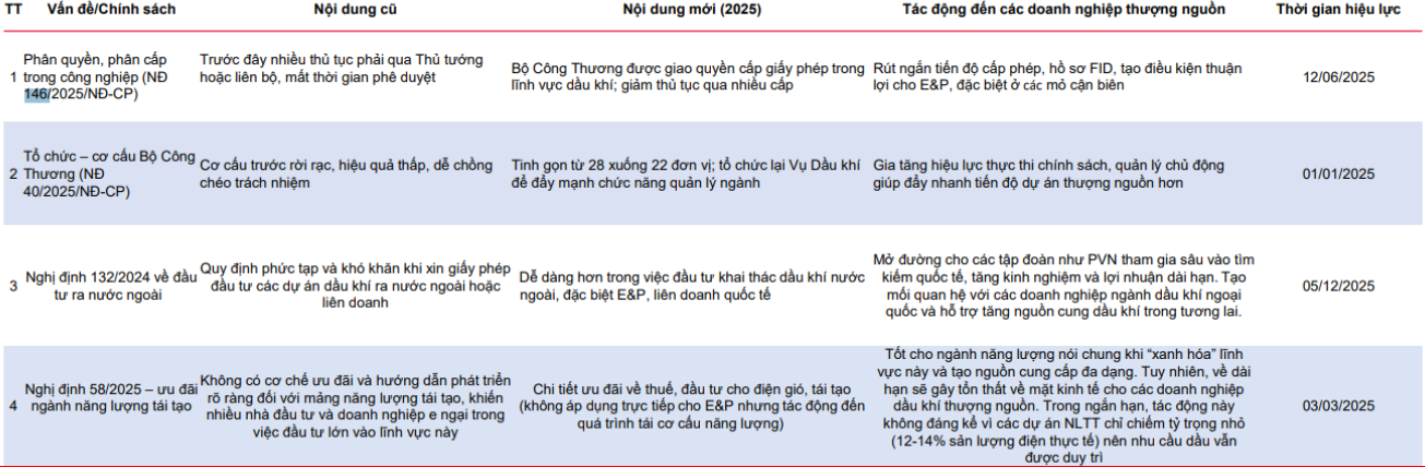 - Nghị định 146/2025: Cho phép Bộ Công Thương chủ động phê duyệt các dự án dầu khí, rút ngắn quá trình xét duyệt FID từ 24–36 tháng còn dưới 12 tháng. Tác động rõ nét đến các mỏ cận biên và lô ngoài khơi chưa phát triển.