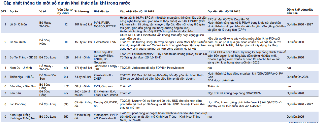 | Dự án | Trữ lượng ước tính | Loại sản phẩm | Tiến độ cập nhật (T8/2025) |
