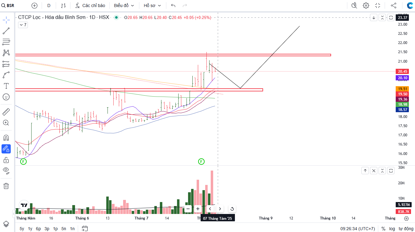 - Khuyến nghị: Nên chờ giá cổ phiếu điều chỉnh về vùng thấp hơn để vào lệnh, thay vì mua đuổi. Sau khi breakout vào ngày 24.7.2025, BSR nhanh chóng gặp cản kháng cự ở vùng giá 22,000-23,000 (là giá mục tiêu của các CTCK). Do đó, BSR cần thêm thời gian để xây nền giá.