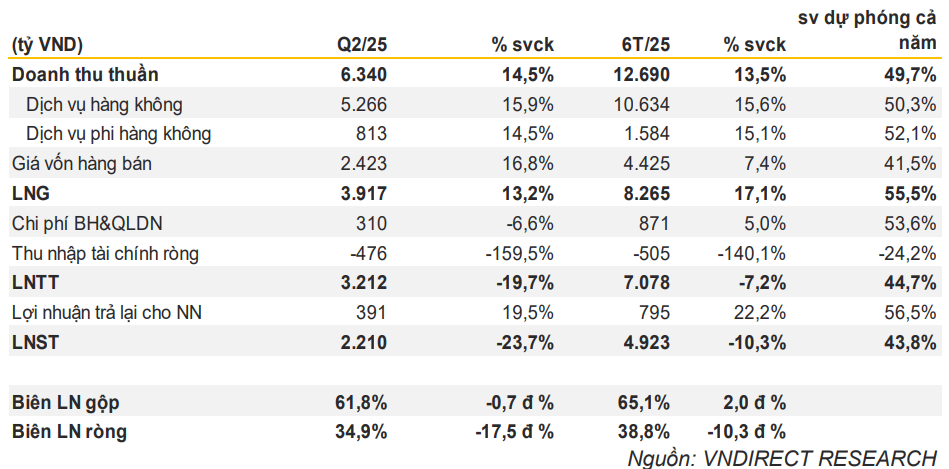 - Doanh thu đạt 6,340 tỷ đồng (+14.5% YoY). Trong đó, doanh thu từ dịch vụ hàng không đạt 5,266 tỷ đồng (+15.9% YoY), trong khi doanh thu phi hàng không đạt 813 tỷ đồng (+14.5% YoY).