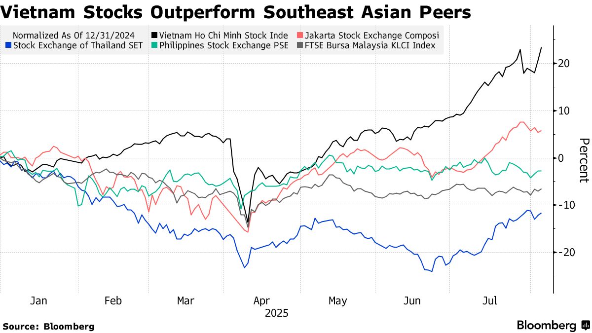 Chỉ số này đã vượt trội so với mọi chỉ số tham chiếu lớn khác trong khu vực khi chạm mức cao kỷ lục vào tháng trước. JPMorgan Chase & Co. dự báo dòng vốn cổ phiếu sẽ tiếp tục sau thỏa thuận gần đây hạ thuế quan của Mỹ đối với hàng hóa Việt Nam xuống còn 20% từ 46% hồi tháng Tư. Ngân hàng này sau đó đã nâng khuyến nghị đối với cổ phiếu Việt Nam lên mức “overweight” và tăng mục tiêu cuối năm cho VN-Index lên tới 1,600 điểm.