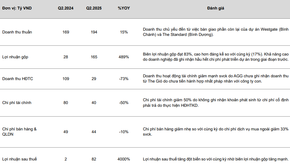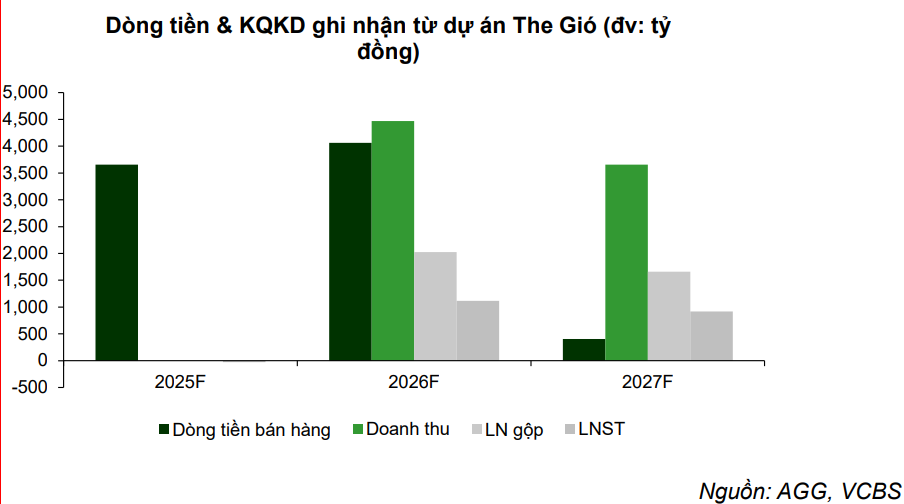 • Ghi nhận doanh thu/lợi nhuận từ 2026: Sau khi hoàn tất sáp nhập pháp nhân Đông Nam Land vào Lộc Phát, AGG sẽ hợp nhất kết quả kinh doanh The Gió. Đây là yếu tố quyết định giúp doanh thu 2026 dự kiến tăng gần 4 lần so với 2025.