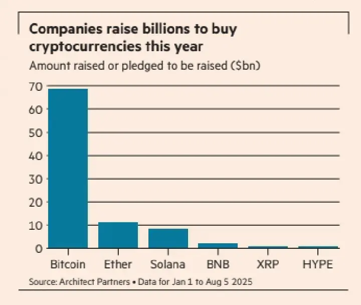 ReserveOne là một thương vụ trị giá 1 tỷ đô la được tài trợ bởi các nhà đầu tư, bao gồm các sàn giao dịch Kraken và Blockchain.com, với kế hoạch mua Bitcoin cũng như các token tiền điện tử khác như Ether và Solana. Ether Machine đã huy động được 1,5 tỷ đô la, và dự định sẽ chi cho Ether. Cựu giám đốc điều hành Barclays, Bob Diamond, đã huy động được 888 triệu đô la trong một thỏa thuận của Spac với một công ty công nghệ sinh học để mua token HYPE. Công ty đầu tư mạo hiểm của tỷ phú tiền điện tử Changpeng Zhao đã dẫn đầu một thương vụ trị giá 500 triệu đô la cho một nhà sản xuất thuốc lá điện tử Canada để mua BNB, token của sàn giao dịch Binance mà Zhao đồng sáng lập.