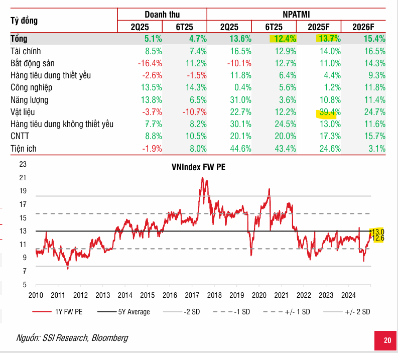 SSI duy trì dự báo tăng trưởng NPATMI toàn thị trường năm 2025 đạt 13.8%, tương ứng với mức tăng trưởng 15.5% trong 6 tháng cuối năm.