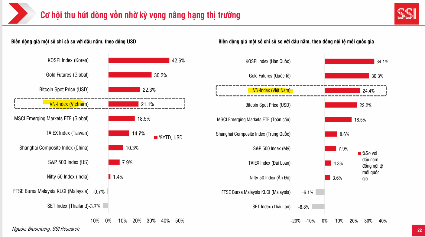Mức tăng hơn 9.2% trong tháng 7 đã giúp TTCK Việt Nam có mức tăng trưởng hơn 24% từ đầu năm, vượt mặt cả Bitcoin. Kỳ vọng nâng hạng thị trường đã kích thích ‘tinh thần động vật” của các nhà đầu tư nội. SSI Research kỳ vọng FTSE Russell sẽ công bố nâng hạng Việt Nam vào thị trường mới nổi vào tháng 10.2025, giúp thu hút thêm 1 tỷ đôla từ các quỹ ETF chỉ số. Mặc dù thị trường có thể đối mặt với biến động ngắn hạn do áp lực chốt lời gia tăng sau giai đoạn margin cao vào cuối tháng 7, SSI Research vẫn kỳ vọng VN-Index hướng tới 1,750-1,800 điểm trong năm 2026.