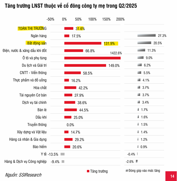 • Lợi nhuận doanh nghiệp phục hồi trên diện rộng: NPATMI quý II tăng 31.5% YoY, dẫn đầu bởi nhóm ngân hàng (chiếm 44% tổng lợi nhuận), bất động sản, tiện ích và bán lẻ; VIC, NVL, VGI, HHS, HVN, PGV, VIX đóng góp 50% mức tăng tuyệt đối.