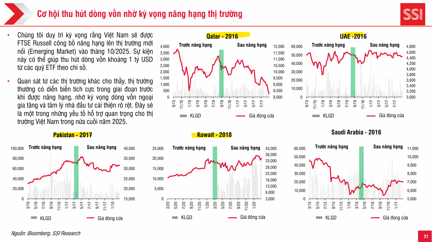 SSI duy trì kỳ vọng rằng Việt Nam sẽ được FTSE Russell công bố nâng hạng lên thị trường mới nổi (Emerging Market) vào tháng 10/2025. Sự kiện này có thể giúp thu hút dòng vốn khoảng 1 tỷ USD từ các quỹ ETF theo chỉ số, tạo động lực tích cực cho thị trường trong nửa cuối năm.