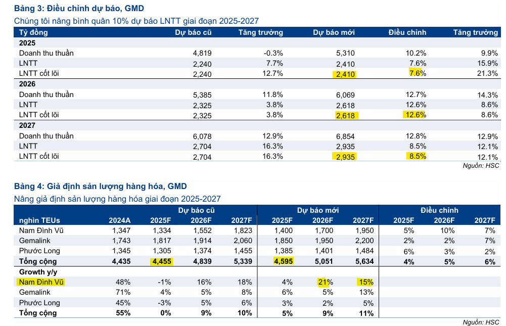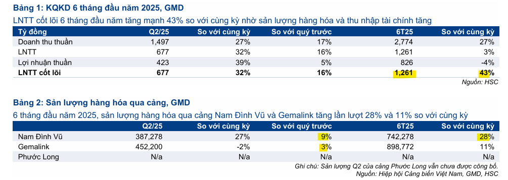 HSC (8.8.2025) đã nâng khuyến nghị đối với GMD từ “Tăng tỷ trọng” lên “Mua vào” với giá mục tiêu mới là 75,200 đồng/cổ phiếu, tiềm năng tăng giá 34%. Động thái này xuất phát từ việc GMD ghi nhận Lợi nhuận trước thuế (LNTT) quý 2/2025 đạt 677 tỷ đồng, tăng 32% so với cùng kỳ và vượt 7% so với dự báo của HSC.
