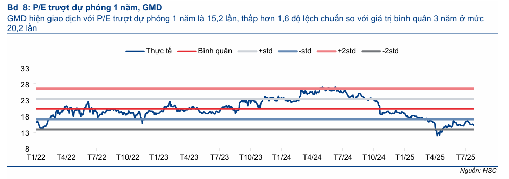 GMD đang giao dịch ở mức P/E trượt dự phóng 1 năm là 15.2 lần, thấp hơn đáng kể so với mức bình quân 3 năm. HSC cho rằng đây là thời điểm thuận lợi để tích lũy cổ phiếu.