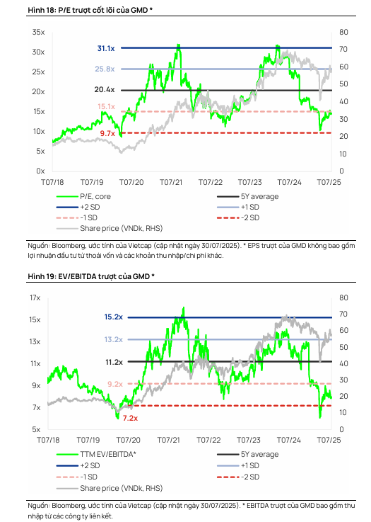 Mặc dù GMD đang giao dịch ở mức EV/EBITDA trượt 8.0 lần, cao hơn nhẹ so với trung vị ngành là 7.6 lần, Vietcap vẫn cho rằng định giá này hấp dẫn nhờ vị thế dẫn đầu và kế hoạch mở rộng công suất trong tương lai.