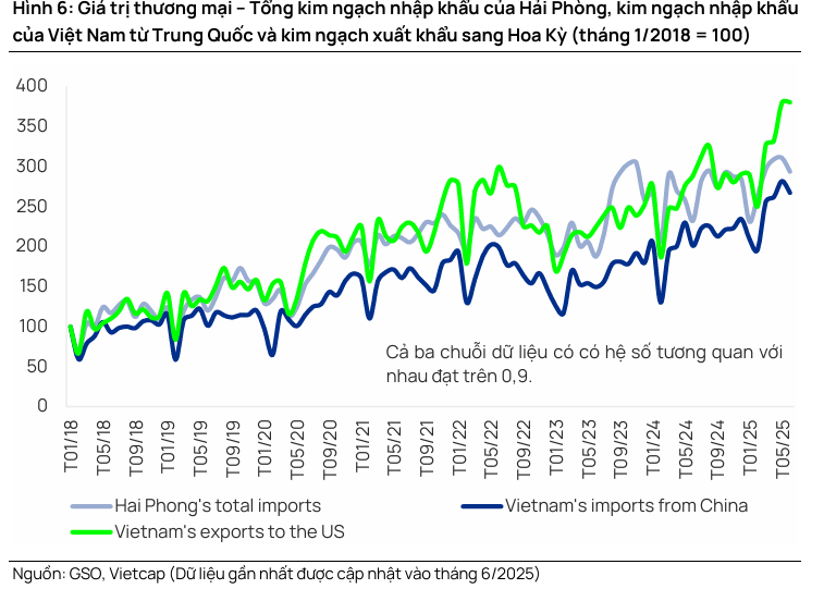 - Đối với Nam Đình Vũ: Thị trường Mỹ chiếm khoảng 10% tổng thông lượng của NDV, phản ánh mức độ phụ thuộc trực tiếp khá hạn chế đối với thuế quan. Tuy nhiên, vẫn tồn tại rủi ro gián tiếp. Trung Quốc chiếm khoảng 50% thông lượng hàng hóa của NDV, và bất kỳ mức giảm nào trong xuất khẩu từ Mỹ cũng có thể làm giảm nhu cầu nguyên vật liệu từ Trung Quốc, từ đó ảnh hưởng đến thông lượng của NDV. Như đã thể hiện trong Hình 6, dựa trên dữ liệu tính từ năm 2018, kim ngạch nhập khẩu vào Hải Phòng có mối tương quan chặt chẽ với cả kim ngạch nhập khẩu của Việt Nam từ Trung Quốc và xuất khẩu sang Mỹ. Cả ba chuỗi dữ liệu có có hệ số tương quan với nhau đạt trên 0.9. Nhìn chung, GML, các cảng phía Nam khác và NDV lần lượt chiếm 40%/30%/30% tổng thông lượng của GMD, tỷ trọng xuất sang thị trường Mỹ chiếm 25% (trước tháng 4/2025) và giảm xuống 17% (sau tháng 4/2025) trên tổng thông lượng.