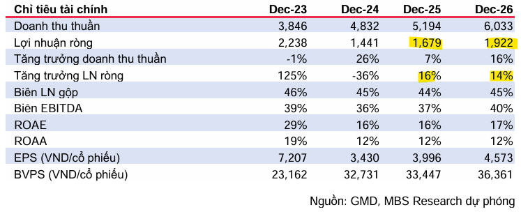 - Điều chỉnh dự báo: MBS điều chỉnh giảm doanh thu cảng nhưng điều chỉnh tăng doanh thu tài chính, dẫn đến lợi nhuận ròng 2025-2026 được điều chỉnh tăng so với dự phóng cũ.
