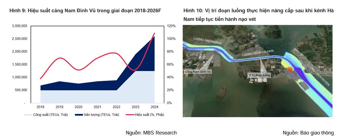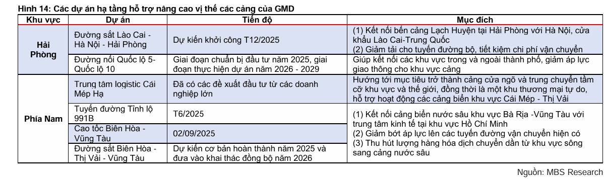 - Triển vọng tăng trưởng bền vững: Kỳ vọng lợi nhuận ròng của GMD sẽ tăng 16.5%/14.4% trong 2025/2026. Động lực chính đến từ việc cảng Nam Đình Vũ GĐ3 đi vào hoạt động từ Q4/2025 và khả năng tăng giá dịch vụ tại các cảng. Đối với khu vực Hải Phòng, MBS đánh giá doanh thu cảng Nam Đình Vũ sẽ duy trì đà tăng mạnh mẽ, bất chấp ảnh hưởng bởi thuế quan do: (1) tỷ trọng hàng hóa xuất nhập khẩu Mỹ chỉ chiếm hơn 10% (so với mức trung bình khoảng 12% của các cảng trong khu vực), (2) sản lượng nội Á sẽ gia tăng bù đắp lượng hàng hóa của Mỹ, khi các quốc gia này nỗ lực giảm tỷ trọng xuất khẩu sang thị trường Mỹ, (3) gia tăng sở hữu tại cảng cạn Hải Minh gần đó, qua đó hỗ trợ cảng Nam Đình Vũ (kỳ vọng có thể giúp tăng thêm khoảng 100,000 TEU) và (4) nâng giá dịch vụ trung bình khoảng 10% từ T8/2025. Ngoài ra, GMD sẽ tiếp tục nạo vét kênh Hà Nam trong Q4/2025, đưa độ sâu kênh đạt 9.5m (so với độ sâu cũ vào khoảng 8.5m), cho phép lưu thông 2 chiều, qua đó nâng cao khả năng tiếp đón tàu của cảng Nam Đình Vũ, qua đó góp phần cải thiện lợi thế cạnh tranh của cảng trong năm 2026, đặc biệt khi dự án cảng Nam Đình Vũ giai đoạn 3 bắt đầu đi vào hoạt động từ Q4/2025.