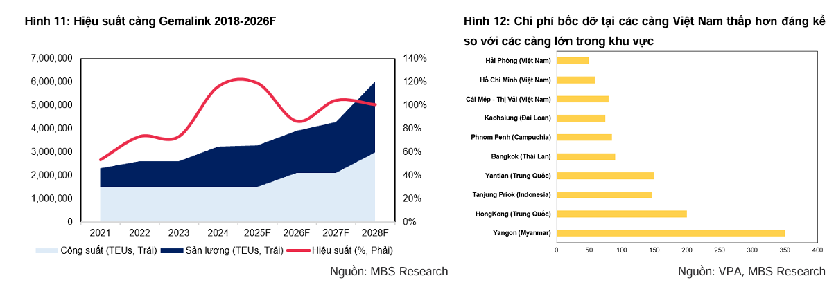 trì lợi thế cạnh tranh do: (1) Tỷ lệ hàng đi Mỹ chỉ chiếm khoảng 30%, thấp hơn so với trung bình trong khu vực khoảng 55% và (2) GMD nỗ lực giảm phụ thuộc vào thị trường Mỹ qua việc mở rộng 4 tuyến dịch vụ mới sang các thị trường khác như Châu Âu, Canada, Úc,… Đối với giá dịch vụ trung bình, do còn nhiều dư địa tăng giá dịch vụ, khi chi phí bốc dỡ vẫn chỉ bằng 50-60% so với các cảng lớn trong khu vực, chúng tôi điều chỉnh tăng giá dịch vụ tại cảng Gemalink lần lượt 4% /6% svck, với kỳ vọng GMD sẽ tăng 10% giá dịch vụ bốc dỡ tại cảng này trong Q4/25.