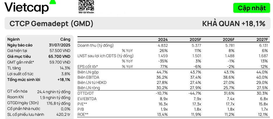 Vietcap (31.7.2025) duy trì khuyến nghị “Khả quan” cho GMD và điều chỉnh tăng 11% giá mục tiêu lên 65,700 đồng/cổ phiếu, với tiềm năng tăng giá 17.3% trong kịch bản cơ sở. Vietcap cũng có cái nhìn tích cực hơn về triển vọng thương mại Việt – Mỹ, dẫn đến việc điều chỉnh tăng kịch bản cơ sở cho mức giảm sản lượng hàng hóa xuất sang Mỹ từ 50% xuống 20%.