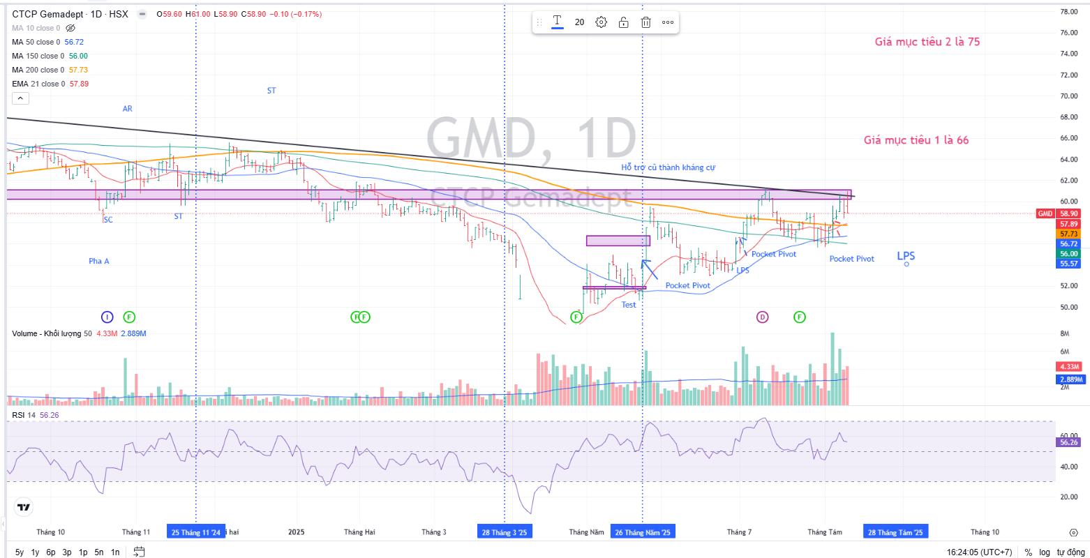 Trên đồ thị, GMD đang có kháng cự tại vùng giá 60,000 đồng, vốn là hỗ trợ cũ này chuyển thành kháng cự. Do đó, GMD cần tích luỹ lại quanh MA50 ngày để xây lại nền giá. Nếu GMD giảm về 53,000-54,000 thì đó là mức hỗ trợ mạnh để xem xét giải ngân.