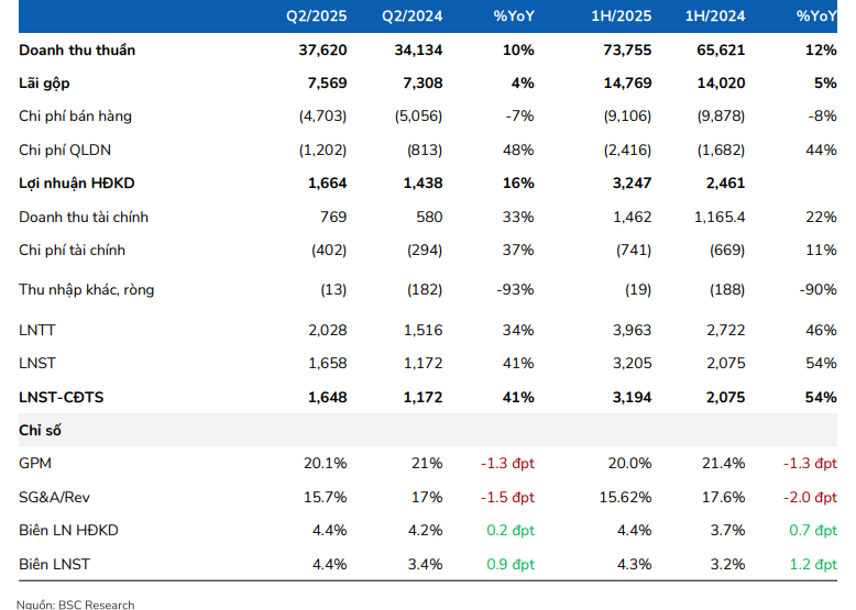 Quý II/2025, doanh thu thuần của MWG đạt 37,620 tỷ đồng, tăng 10% so với cùng kỳ. Trong đó: