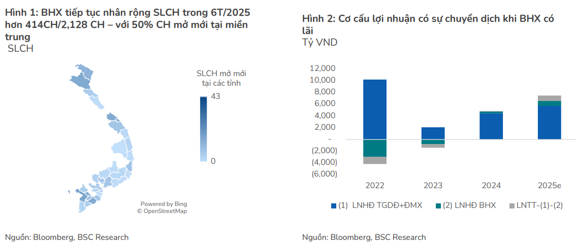 Sau nhiều năm đầu tư mở rộng, BHX chính thức ghi nhận lợi nhuận dương và đang trở thành “động cơ tăng trưởng” mới của MWG. Việc tái cơ cấu ngành hàng, tối ưu mô hình và mở rộng tại các khu vực tiềm năng như miền Trung giúp biên lợi nhuận cải thiện rõ rệt.