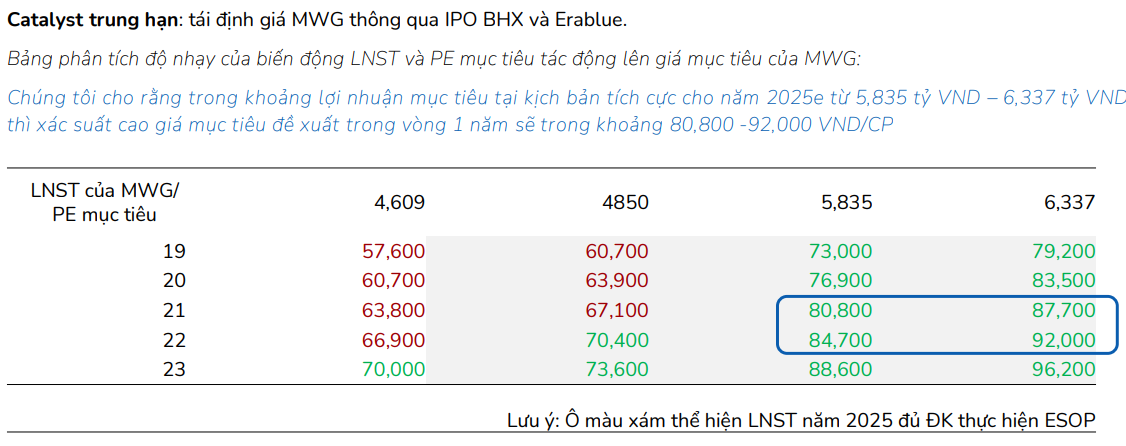 Theo kịch bản tích cực, giá có thể lên vùng 80,800–92,000 đồng/cp nếu lợi nhuận 2025 đạt 5,835–6,337 tỷ đồng, đồng thời các chất xúc tác như IPO BHX hoặc chu kỳ hồi phục ICT–điện máy được kích hoạt.
