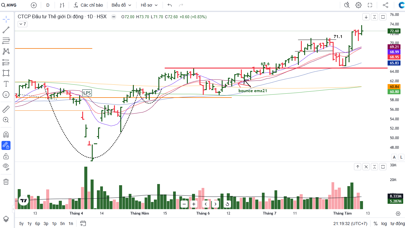 Trên đồ thị kỹ thuật, MWG có RS=80, thuộc nhóm các cổ phiếu hoạt động tốt trên thị trường. Về mặt ngắn hạn, MWG chưa hẳn rẻ nếu chỉ nhìn P/E trailing. Về mặt trung hạn, MWG vẫn hấp dẫn nếu tin vào kịch bản tăng trưởng lợi nhuận >20%/năm và các chất xúc tác sẽ hiện thực hóa. Đối với các trader muốn mua bổ sung, canh nhịp MWG pullback về MA50. Fair Value tại giá 80.x