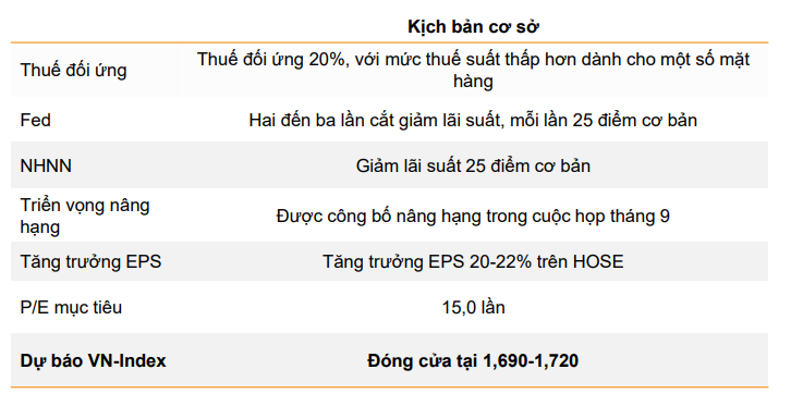 | Động lực chính | – Khung thuế đối ứng rõ ràng – Fed cắt giảm lãi suất 2-3 lần – Tăng trưởng EPS 20-22% |