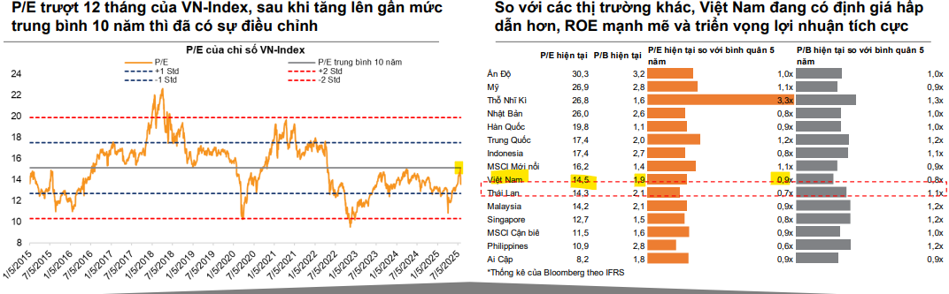 - Định giá: P/E trượt 12 tháng của thị trường đạt lần, chiết khấu so với mức trung bình 10 năm.