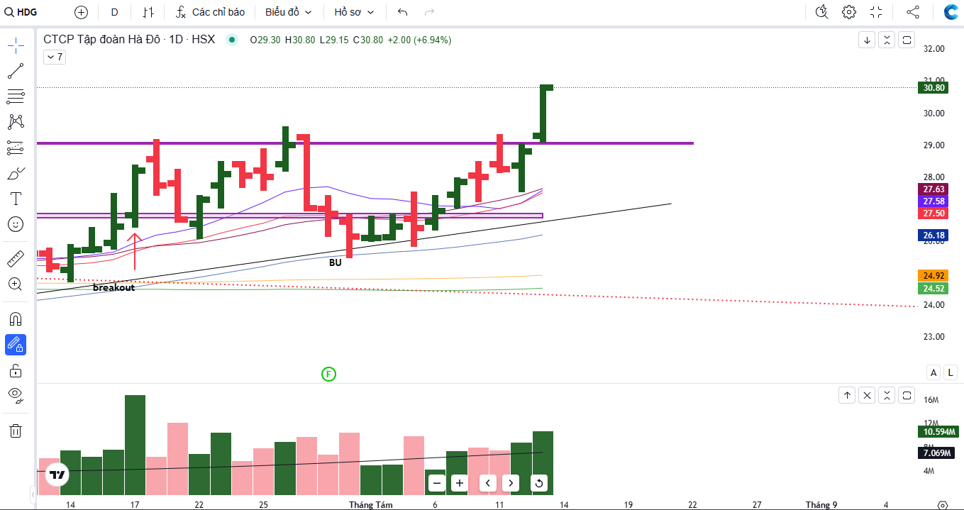 Trên đồ thị kỹ thuật, HDG có RS = 76, thuộc nhóm các cổ phiếu hoạt động tốt trên thị trường. Elibook Team đã liên tục khuyến nghị mua quanh vùng giá 26,800 đồng, hôm nay ngày 13/8, HDG chính thức breakout. Lưu ý, hàng cơ bản đang thay phiên nhau tăng mạnh