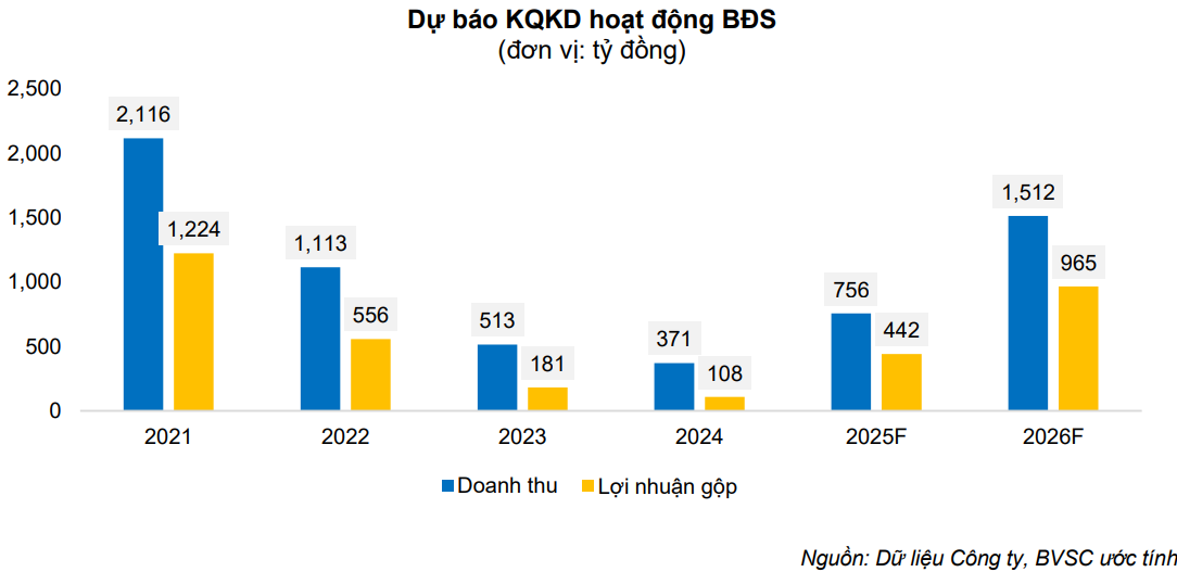 - Năm 2025, công ty dự kiến bàn giao khoảng 20 căn, ghi nhận 672 tỷ đồng doanh thu và 429 tỷ đồng lợi nhuận gộp. Năm 2026, số lượng bàn giao dự kiến tăng lên 45 căn, mang lại 1,512 tỷ đồng doanh thu và 965 tỷ đồng lợi nhuận gộp.