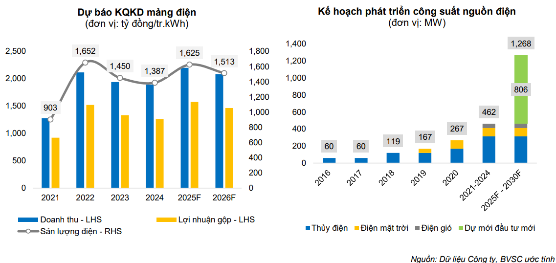 Trong mảng năng lượng, dự báo năm 2025 sản lượng điện đạt 1,625 triệu kWh, tăng 17% so với năm 2024. Doanh thu mảng này ước đạt 2,200 tỷ đồng, tăng 16%, và lợi nhuận gộp đạt 1,576 tỷ đồng, tăng 25%.